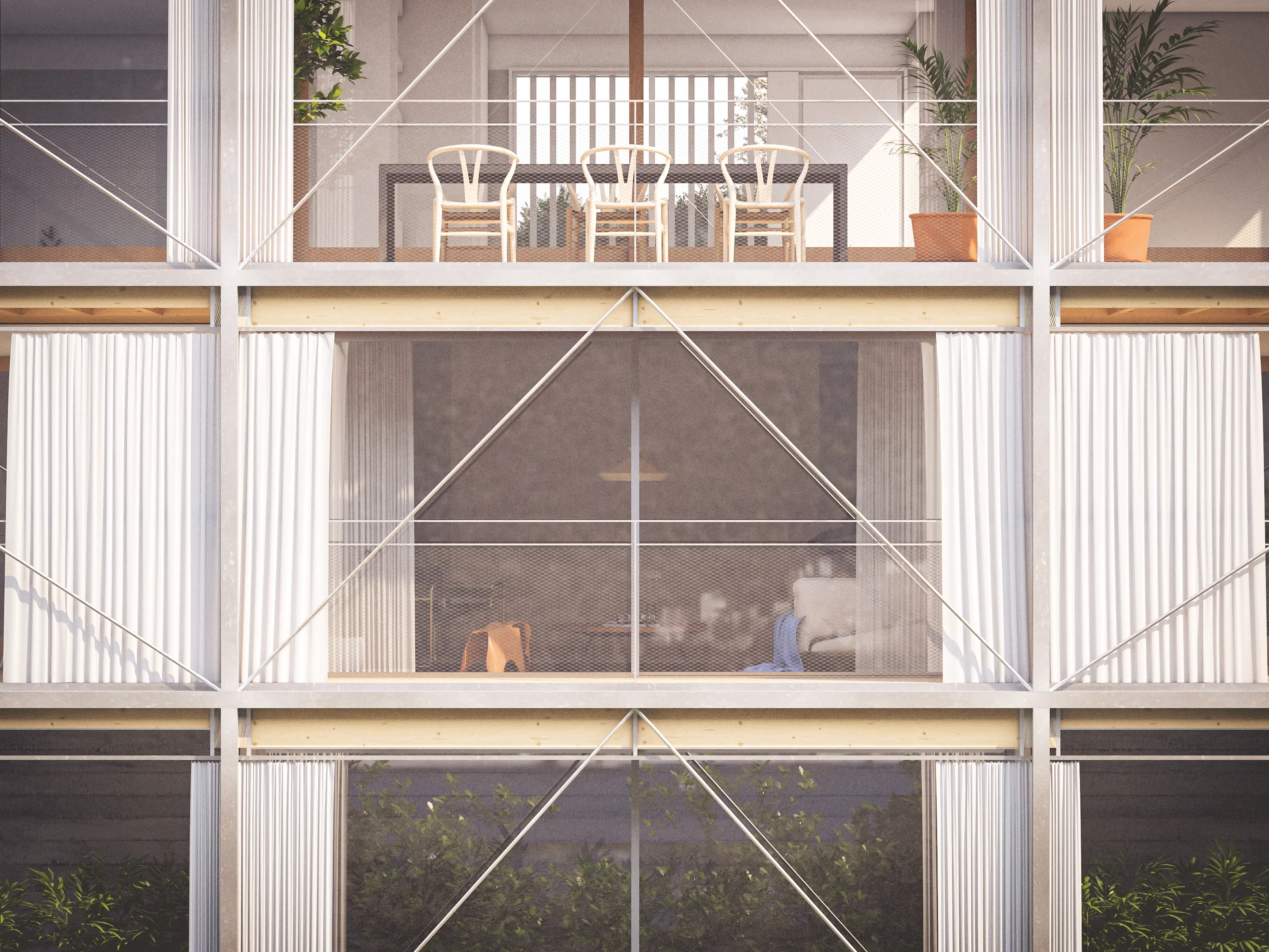 L'intervention privilégie les faibles sections d'une construction métallique, permettant de ne pas compromettre les vues depuis les intérieurs et facilitant le chantier, cherchant également ainsi à s'émanciper d'une architecture existante très marquée, instaurant un dialogue entre la masse dominante de béton de cette dernière et une nouvelle structure en filigrane.