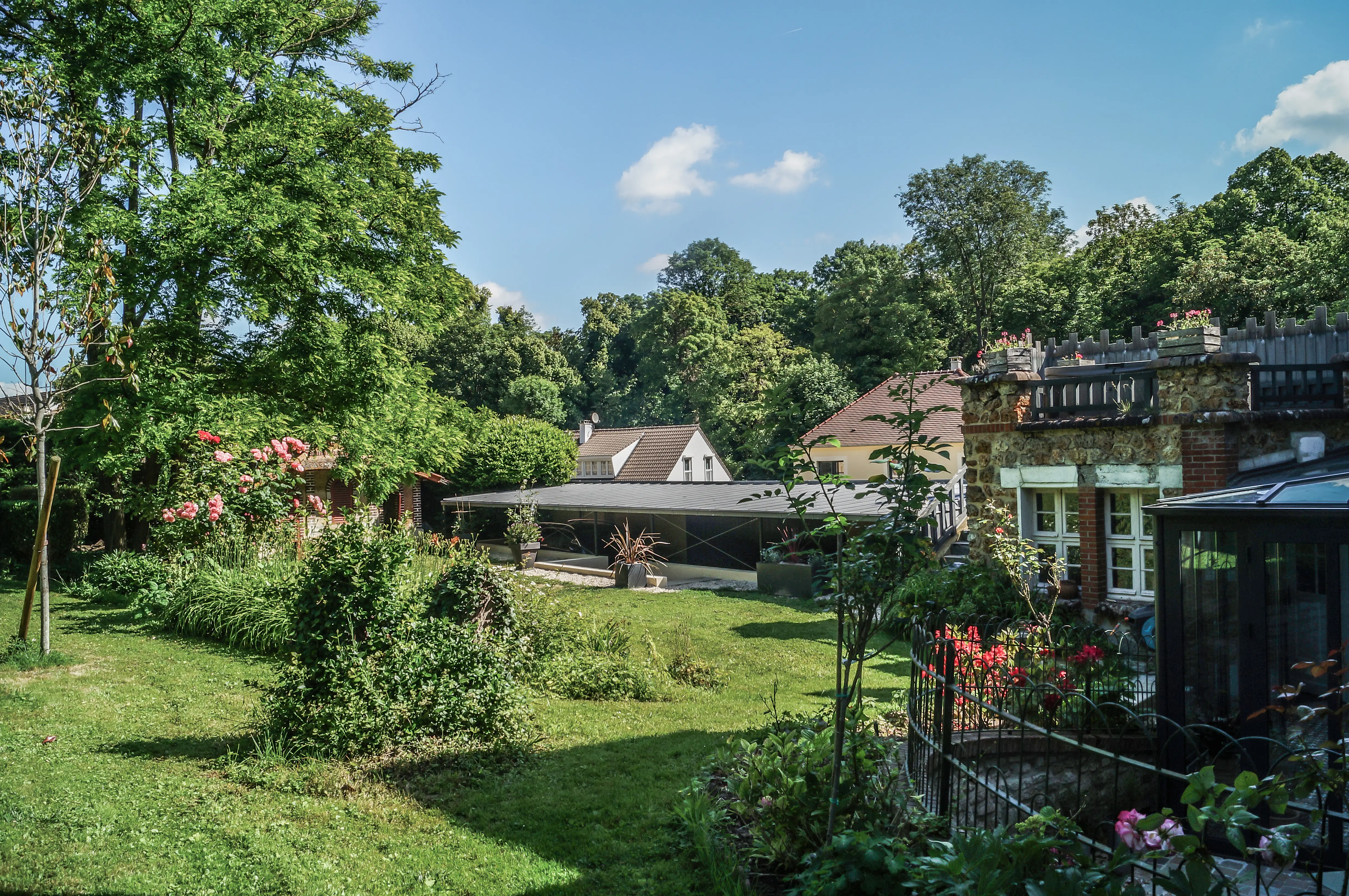 L'intervention consiste à insérer une surface de stationnement abritée et une véranda au sein d'un ensemble architectural singulier : une meulière typique du début XXe, située en bordure du centre historique de Maule.